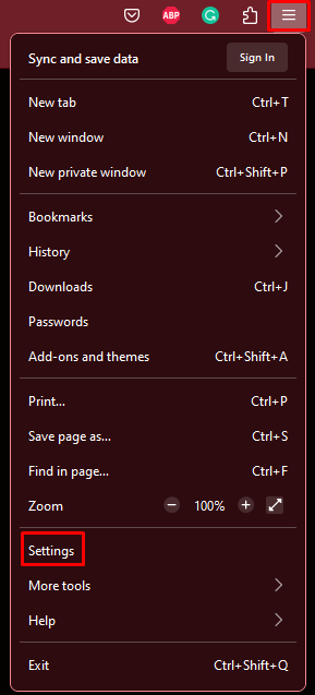 1. Abra Firefox y vaya al menú de hamburguesas en la esquina superior derecha. Seleccionar Ajustes del menú desplegable.