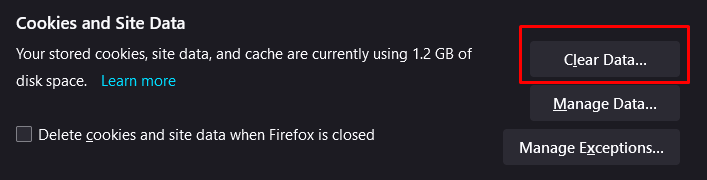 1. Desplácese hacia abajo hasta llegar a la Cookies y datos del sitio sección. Haga clic en el Borrar datos botón.