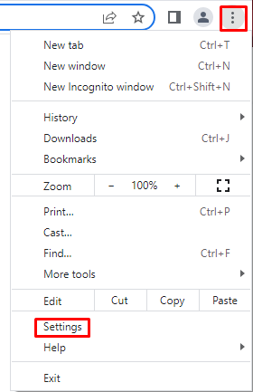 1. Abre Chrome y ve a la menú de tres puntos en la esquina superior derecha. Seleccionar Ajustes del menú desplegable.