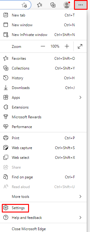 1. Abra el navegador Microsoft Edge. Vaya al menú de tres puntos en la esquina superior derecha y seleccione Ajustes del menú desplegable.