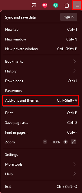 1. Abra el navegador y vaya a un menú de hamburguesas. Seleccionar Complemento y temas del menú desplegable.