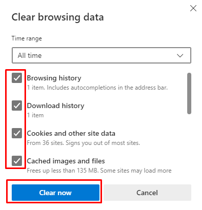 1. Seleccionar Historial de navegación, Historial de descargas, Cookies y otros datos del sitioy Imágenes y archivos en caché limpiar. Luego haga clic en el Despejado ahora botón para ejecutar.