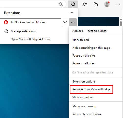 1. Se abrirá una ventana emergente con una lista de todas las extensiones instaladas. Aquí puede desactivarlos, o hacer clic en los tres puntos y seleccionar Eliminar de Microsoft Edge.