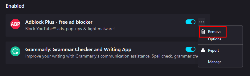 1. Para deshabilitarlos, desactive la extensión. Para eliminarlos, haga clic en los tres puntos junto al interruptor de palanca y seleccione Eliminar.