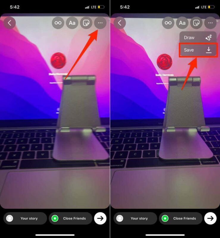 1. Puede guardar el video de Boomerang en el carrete de la cámara de su dispositivo antes de publicarlo en su tienda. Toque en el icono de menú de tres puntos en la esquina superior derecha y seleccione Ahorrar.