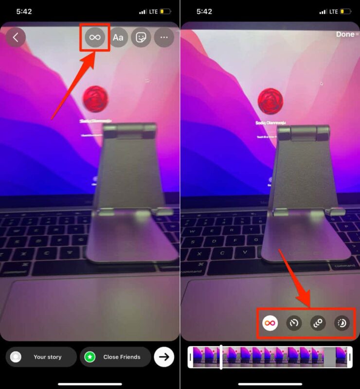 1. Use filtros y pegatinas para darle vida al clip de Boomerang como lo haría con fotos y videos. Toque en el Icono de bucle infinito junto a la herramienta de texto para explorar más opciones de personalización específicas de Boomerang.