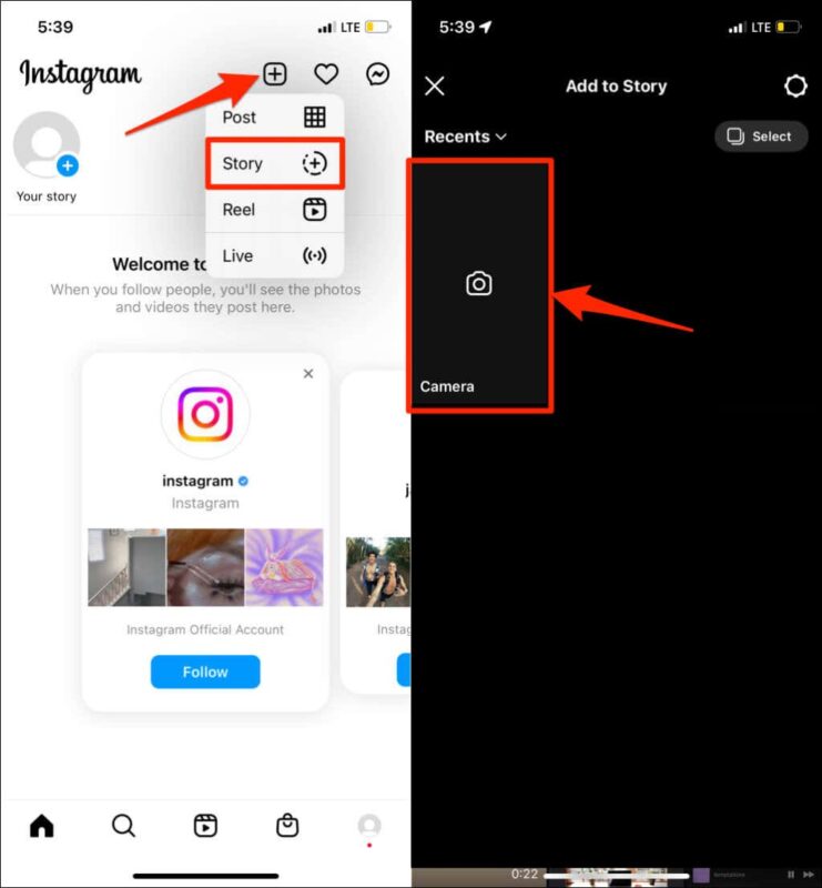 1. Abre Instagram, toca el icono más en la esquina superior derecha y seleccione Historia.
