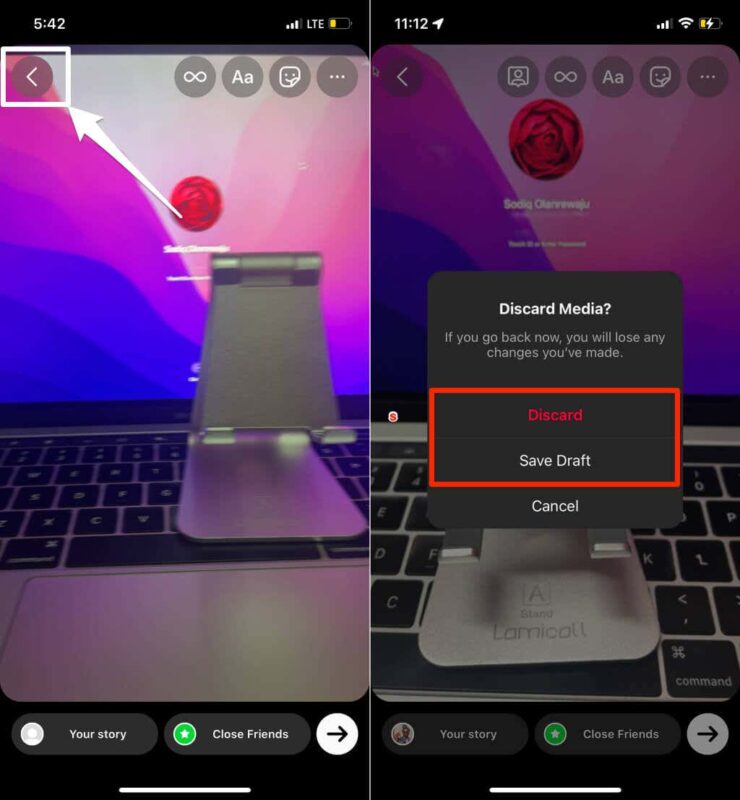 Si no le gusta el clip, deséchelo o guárdelo como borrador y cree uno nuevo. Toque en el icono de flecha hacia la izquierda en la esquina superior izquierda de la pantalla y seleccione Desechar o Guardar borrador.