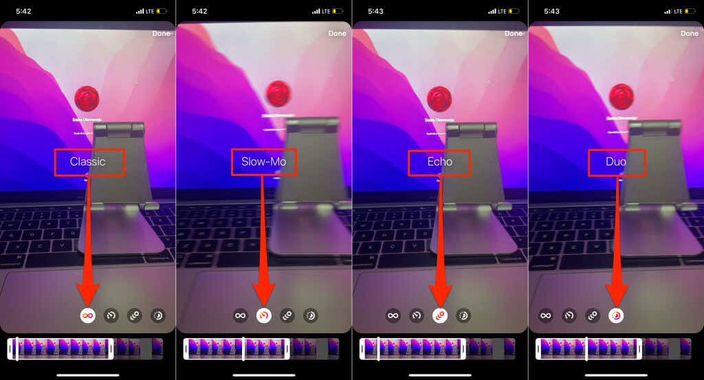 Instagram tiene cuatro modos Boomerang para historias: Clásico, Cámara lenta, Ecoy Dúo. «Clásico» es el modo Boomerang predeterminado, mientras que «Cámara lenta» agrega un efecto de cámara lenta al clip grabado. Con «Echo», tu Boomerang tendrá un efecto de desenfoque de movimiento. “Duo” acelera y desacelera el Boomerang en intervalos alternos.
