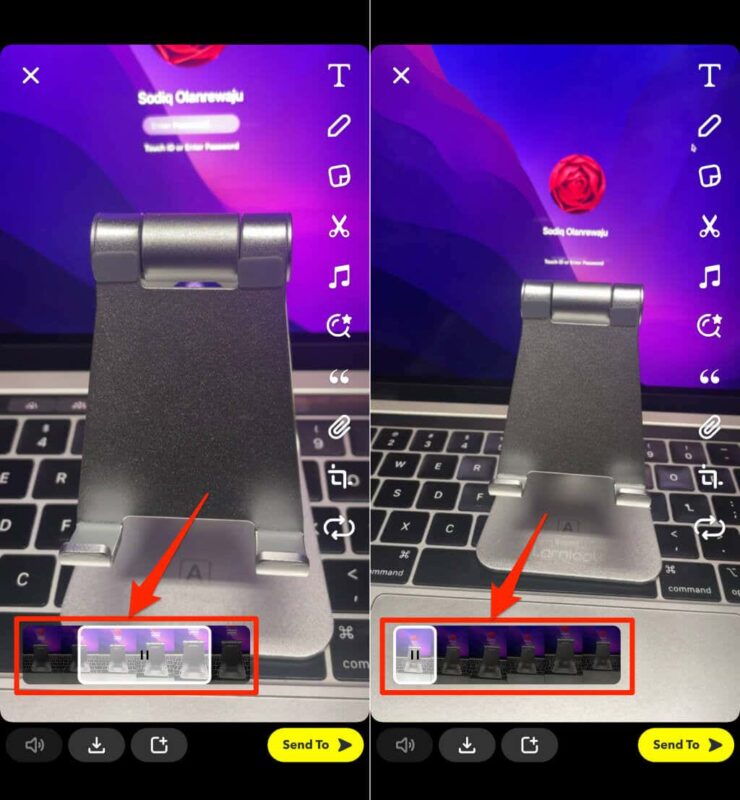 1. Snapchat agregará un efecto de «Rebote» al primer segundo de la grabación. Mueva el resaltado de la línea de tiempo a la parte del video que desea convertir en un clip de rebote. Solo puede recortar/recortar un video de rebote si el clip grabado dura más de un segundo.