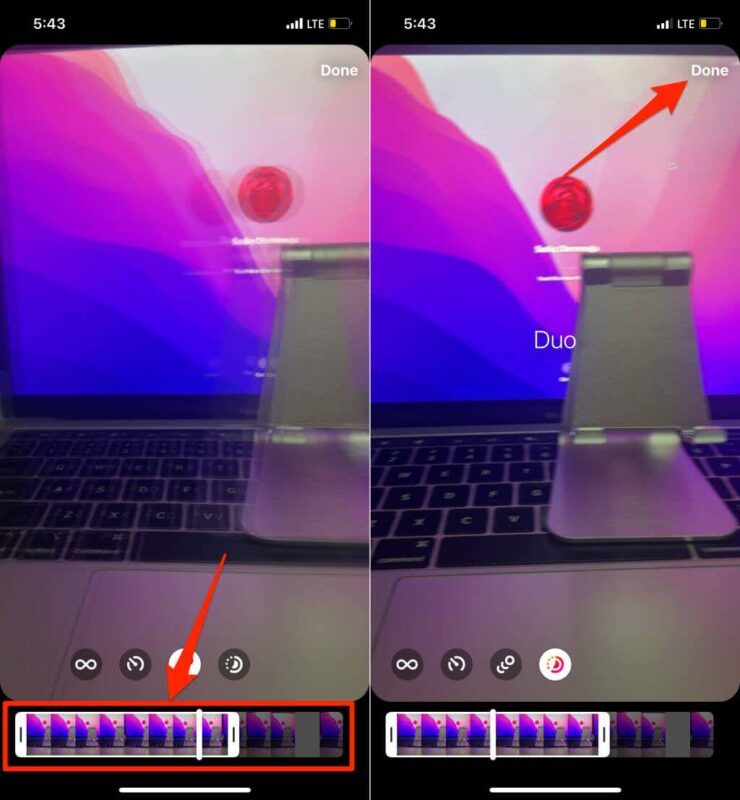 1. Hay una Recortar en la parte inferior de la página de selección de modo. Mueva la herramienta desde el borde izquierdo o derecho para recortar partes específicas del video. Tocar Hecho en la esquina superior derecha después de ajustar el bucle o la duración del video.