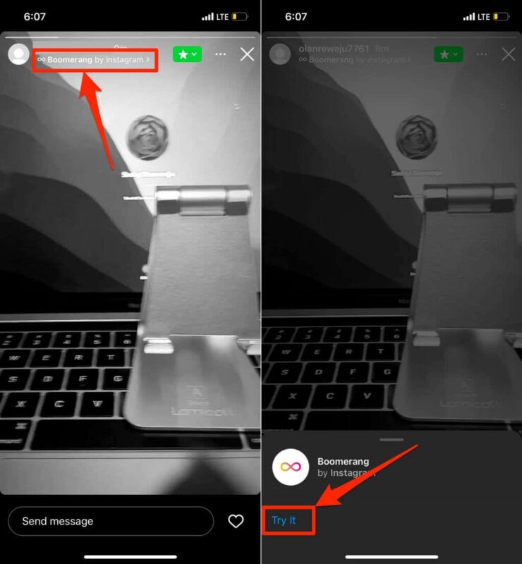 Tus seguidores o amigos cercanos verán una etiqueta de «Boomerang» cuando vean la historia. Pueden tocar la etiqueta y seleccionar Intentalo para crear un Boomerang en su dispositivo. También puede hacer lo mismo al ver Boomerangs en las historias de Instagram de las personas. Toque la etiqueta Boomerang en la historia y seleccione Intentalo.